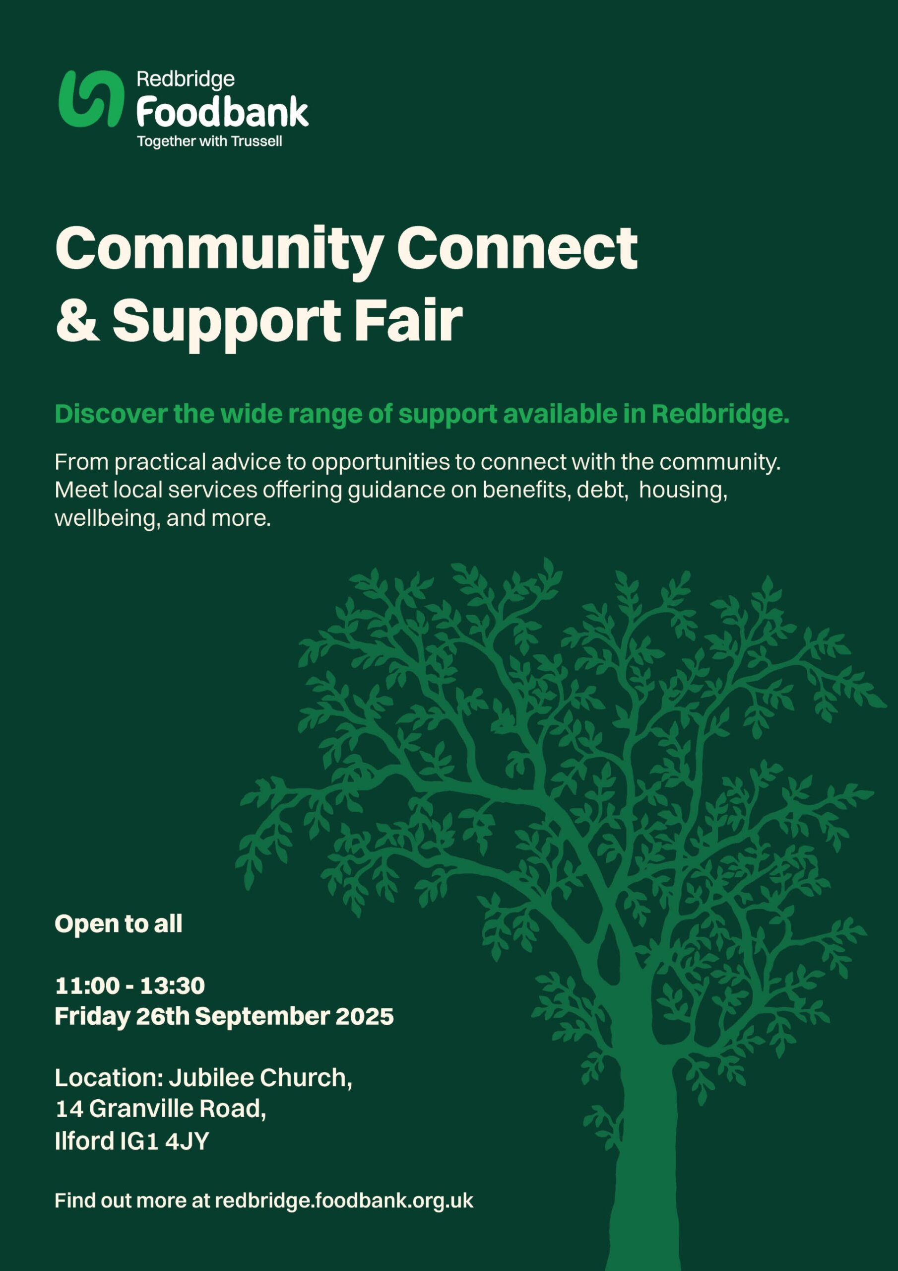The Redbridge Foodbank is hosting a Community Connect & Support Fair on Friday 26th September 2025, from 11:00am to 1:30pm.